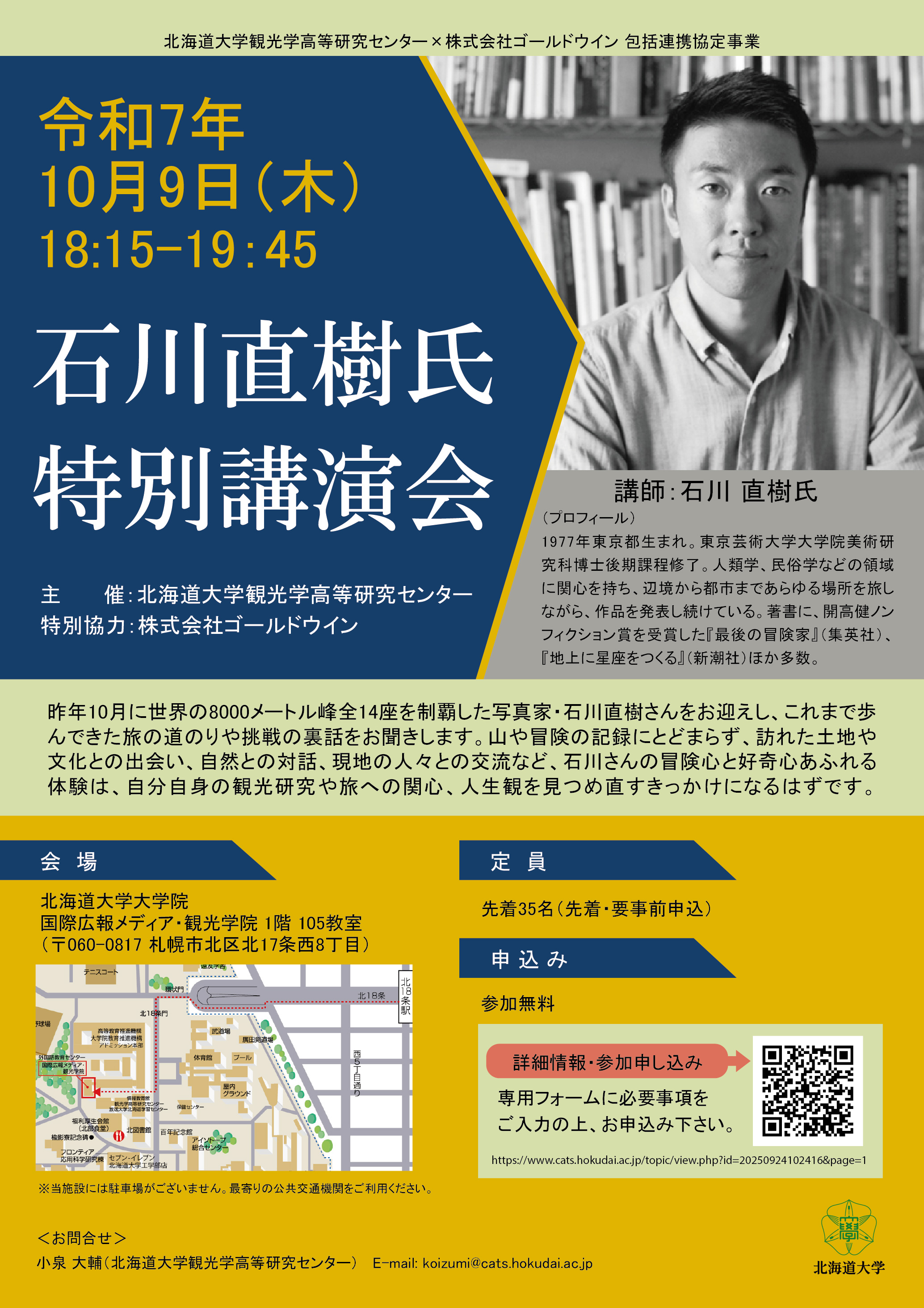 北海道大学観光学高等研究センターは、令和7年10月9日(木)に「石川直樹氏 特別講演会」を開催いたします。