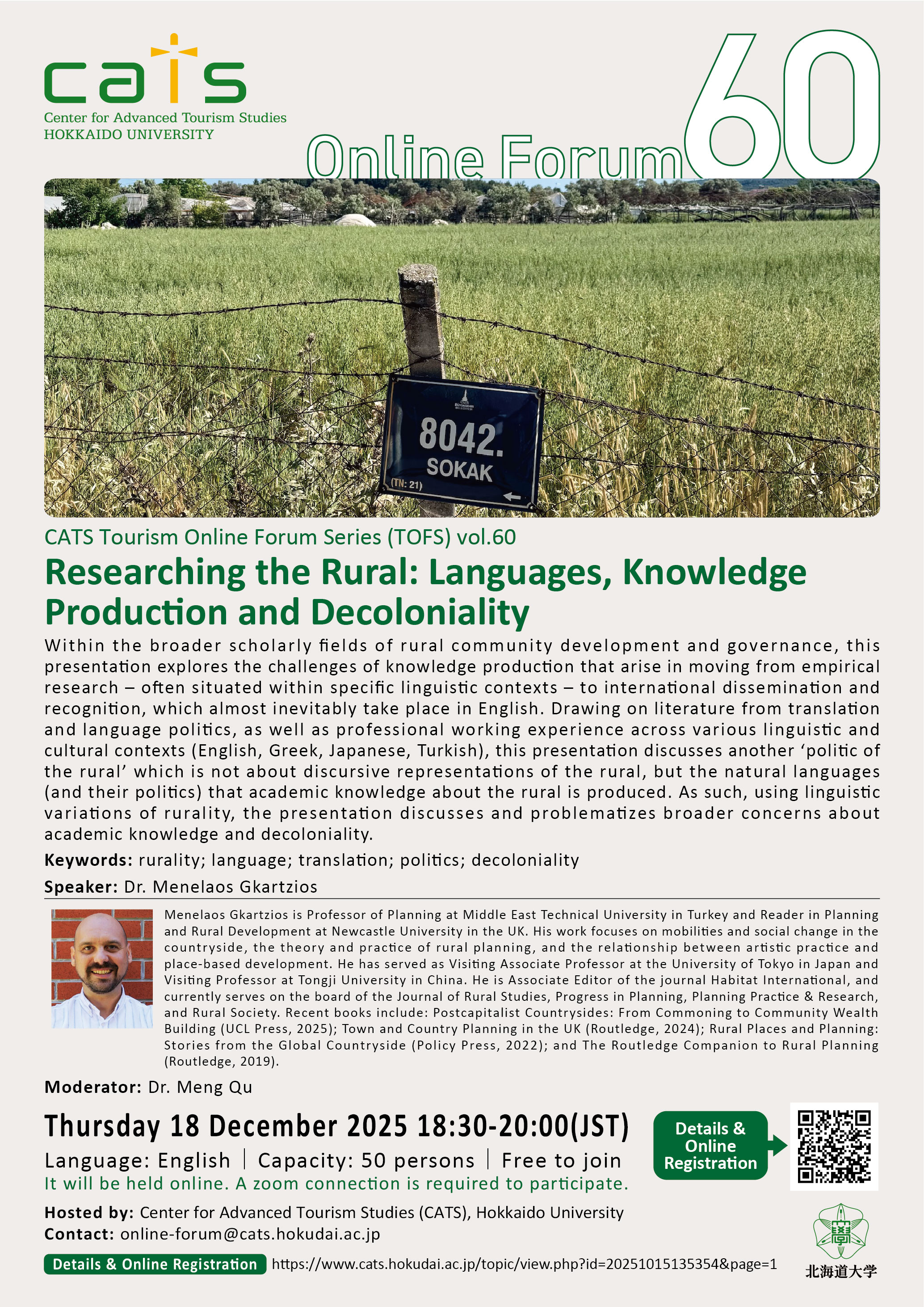 Within the broader scholarly fields of rural community development and governance, this presentation explores the challenges of knowledge production that arise in moving from empirical research – often situated within specific linguistic contexts – to international dissemination and recognition, which almost inevitably take place in English. Drawing on literature from translation and language politics, as well as professional working experience across various linguistic and cultural contexts (English, Greek, Japanese, Turkish), this presentation discusses another ‘politic of the rural’ which is not about discursive representations of the rural, but the natural languages (and their politics) that academic knowledge about the rural is produced. As such, using linguistic variations of rurality, the presentation discusses and problematizes broader concerns about academic knowledge and decoloniality.