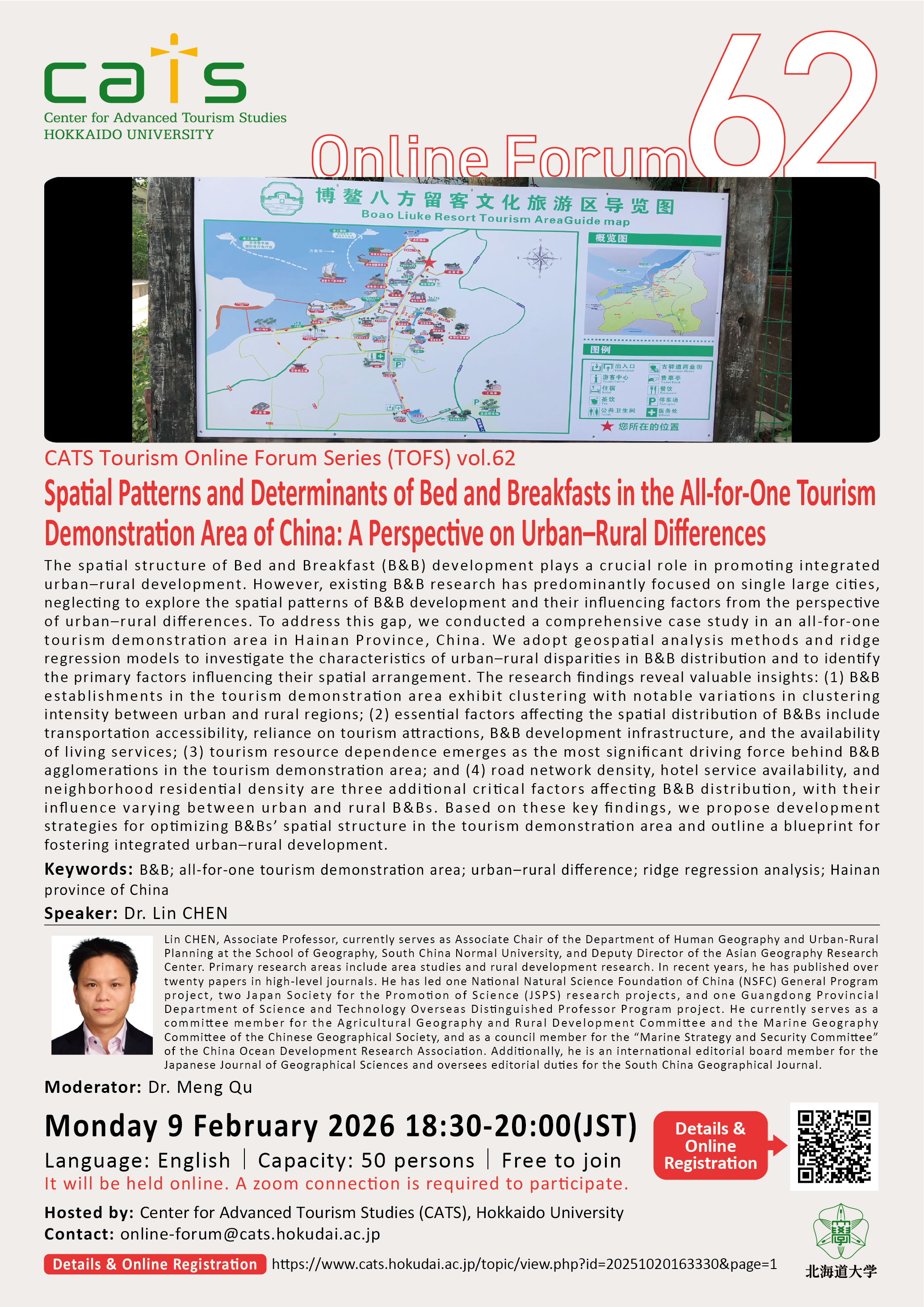 CATS will hold the Tourism Online Forum Series (TOFS) vol.62 on Monday, February 9. Anyone is welcome to attend. We look forward to your participation.